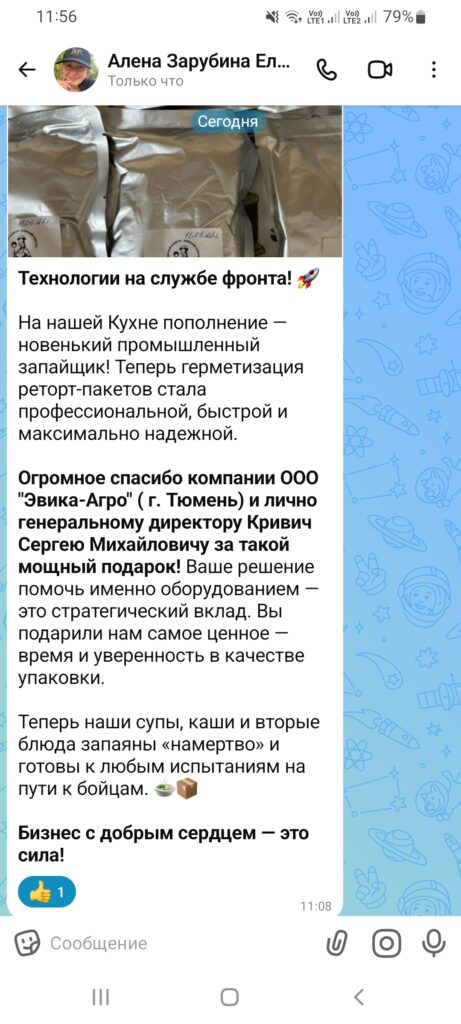 В ноябре 2024 года на средства, собранные нами, работниками «Эвика-Агро» и перечисленные на наш специальный счет решением руководителей наших предприятий для помощи бойцам ВС РФ, выполняющим боевые задачи в зоне проведения СВО приобретены и в декабре переданы непосредственно в части четыре квадрокоптера. Доставкой коптеров до места занимались представители Тюменского отделения ОО «Офицеры России». Груз доставлен до адресата и бойцы выражают слова благодарности за этот подарок, который не только поможет им в выполнении поставленных командованием задач, но и спасет многие жизни наших военнослужащих.